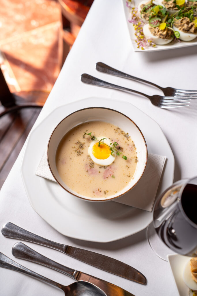 • Barszcz biały z jajkiem i kiełbasą – 45 zł